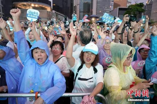 集会期间,时而大雨倾注,参加者尽管不停地用毛巾擦拭,脸上、衣服上还是留下了雨水和汗水。一位70多岁、拄着拐杖的老太太说,不希望香港继续混乱下去,暴力示威者的行为已超越界线。虽然已经很累,但会坚持站到集会结束。