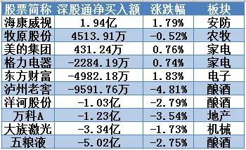 深股通净买入个股仅有3只,只有海康威视1只个股净买入额超过亿元继续居首,此外有4个股净卖出额超过亿元,五粮液净卖出额达5.02亿元居首。