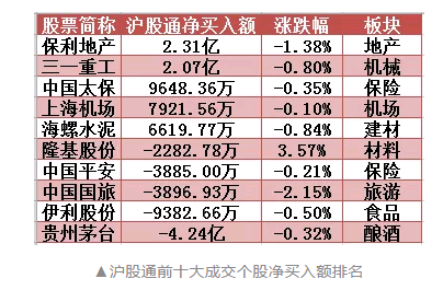 在各自的前十大成交个股中,沪股通净买入5只,保利地产和三一重工2只个股净买入额超过亿元,另有贵州茅台1只个股净卖出额超过亿元,达到4.24亿元继续居首;