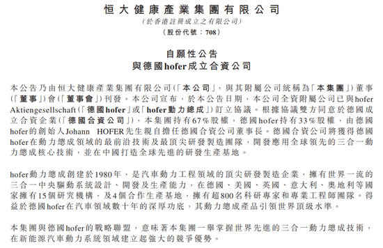 新浪财经讯 7月24日消息,恒大健康(00708.HK)今日早间公告,公司全资附属公司已与德国hofer订立协议。根据协议,双方同意于德国成立合资企业,集团持有67%股权, 德国hofer持有33%股权。