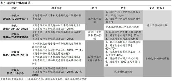 新股发行曲折中走向常态化。自20世纪90年代全国统一的证券市场建立后,中国的新股发行体制在实践中不断探索与改革,按照定价方式及配售方式在不同时间点呈现的不同特征,我们大致将新股发行改革划分为三个大阶段:萌芽初创期(1990-1998):主要实行固定价格发售机制,确认“上网定价”配售方式。从定价方式来看,固定价格简便易行,对市场化程度要求不高,资本市场成立初期市场发展尚未成熟,因此,新股发行主要采取这种固定价格模式,且普遍采用市盈率定价法,根据发行企业的每股收益和一个相对固定的市盈率水平来确定,即“新股发行价格=每股税后利润×市盈率”;从配售方式来看,期间先后出现发售认购证、与储蓄存款挂钩、全额预缴、上网定价等配售方式,其中,后三种方式在证监会发布《关于股票发行与认购方式的暂行规定》加以确认,但从实际应用来看,“上网定价”方式被证实是最为方便、高效和公平的方式,并因此被长期采用。创新探索期(1999-2008):询价定价机制建立,并进一步完善上网定价制度。定价方面,1998年底,《证券法》颁布之后,证券市场先后推出了一系列新股发行定价方式的创新举措,如询价方式、上网竞价发行、网上累计投标等,最终,证监会于2004年发布《关于首次公开发行股票试行询价制度若干问题的通知》,新股询价制度正式出台。其核心在于:规定发行人及其保荐机构应采用向机构投资者累计投标询价的方式确定发行价格。同时,为了促使参与询价的机构理性报价和加强市场对询价过程的监督,规定了全额缴款、同比例配售、申购及配售情况公告、获配股票锁定期等四项主要措施。配售方面,为使发行机制更加灵活,更能适应新股发行供求关系的变化,中国新股发行机制陆续引进了一些二次发售机制,如“绿鞋”机制和“回拨”机制。前者有效调剂了供求,发挥了稳定股价的作用;后者为机构投资者与一般投资者之间建立了一种利益调节机制,也在一定程度上改善供求关系。快速发展期(2009-至今):目前市场的新股发行规则主要是从2009年逐步修改完善的,2009年6月10日,证监会发布《关于进一步改革和完善新股发行体制的指导意见》,标志新股发行体制改革正式启动,此后密集地进行了几轮改革,不断健全新股发行体制、强化市场约束机制。我们通过将这一大阶段划分为五个小阶段,具体对这几轮改革的主要内容进行回顾梳理,并从发行、定价、配售、上市初期交易管制几个角度进行分析(见表1):