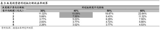 综合以上分析,我们尝试对科创板网下打新年化收益率进行测算。科创板新股涨跌幅方面,我们通过结合创业板开板涨幅和市盈率进行预测,2014-2019年(截至2019/7/15)创业板新股上市到开板涨幅平均值为255.36%,定价方面,由于2013年底进行了发行市盈率窗口指导,2014年起市场新股市盈率中位数稳定在23倍,则经过开板涨幅后的创业板股票市盈率均值在81.7倍左右。而科创板定价方面对于上市股票的定价淡化了23倍市盈率限制,所有股票均采用市场化询价发行机制,我们假设科创板新股上涨后的市盈率将趋近于创业板经历开板涨幅后的市盈率,对25家已完成网下初步配售和网下发行的科创板股票计算得发行市盈率均值为58.7倍,当科创板的市盈率从58.7倍上涨到81.7倍时,股价上涨了39.2%,所以我们保守估计科创板新股涨幅在40%左右。结合以上假设,我们对不同打新配售规模和新股涨跌幅情况下的科创板A类账户打新收益率进行敏感性测试,得到在打新配售规模为1-2亿、新股涨跌幅为40%的假设条件下,科创板A类账户打新收益率区间为7.6%-15.1%(具体收益率敏感性测试参照表3)。我们发现除了科创板市场扩容预计将直接推动收益的提升之外,科创板A类账户打新收益率同时受到打新配售规模的影响,过大的规模会摊薄“打新”带来的收益,并且新股上市的涨幅也会影响打新收益率,投资者需要挑选好的公司以获取更高收益,同时采用多账户小规模打新的方式以实现效率最优化。