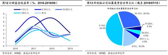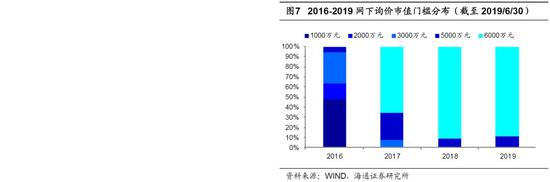 参考历史打新基金表现,规模越小收益越优。2015年底取消了新股申购预缴款制度,对市场来说有效缓解了巨额申购资金的抽血效应,但却使得中签率大幅降低。2009-2015网下中签率平均值为6.22%,2016-2019/06该值降至0.02%。从实际情况看,机构投资者需要配置一定的股票底仓方能参与网下配售。2014年5月起政策规定网下投资者必须持有不少于1000万元市值的非限售股份,而实际的网下询价市值门槛大多为6000万元。目前机构打新主要分为两种模式,一种是“股票底仓+打新”,另一种是“固收+股票底仓+打新”,考虑到目前市场上主流的打新基金一般为“固收+股票底仓+打新”模式,我们选取2016年恢复IPO以来的99只打新基金(偏债/灵活配置,2016-2019/06配债分别大于70%,剔除获配新股小于12只的基金),测算其实际收益率。统计结果显示在2017年、2018年、2019年截至6月末的时间区间内,这99只基金整体加权平均收益率分别为4.99%,2.60%和2.83%,其中1-5亿元打新基金的实际收益率分别为4.92%,6.95%和3.30%;5-10亿元打新基金的实际收益率分别为7.27%,2.84%和2.90%。1-5亿元规模下的打新基金表现相对更好,由于基金规模偏大受到来自市场涨跌波动的影响也较大,同时过大的基金规模也会摊薄“打新”带来的收益,导致打新收益率受到影响。