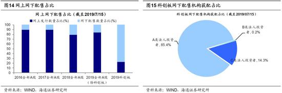 ② 网下配售中A类账户获配新股比例预计为45.7%左右。网下配售中A类账户获配新股比例=网下配售占总发行数量比例×A类获配股票数量占网下配售比例=(A类获配股票数量/网下配售股票数量)×(网下配售股票数量/新股发行总数量),我们选取25家已完成网下初步配售和网下发行的科创板股票作为样本,统计得到战略投资者的分配比例在30%左右,剔除战略投资者后“网上+网下”中网下投资者的获配比例均值为76.4%,其中A类获配股票数量占网下配售比例为85.4%,B类为0.2%,C类为14.3%。将统计数据代入公式计算得到网下配售中A类账户获配新股比例约为45.7%。
