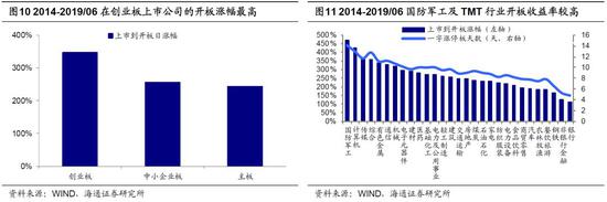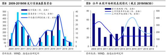 回顾历史上新股发行,创业板和科技行业表现较好。回顾往年新股的表现,总体来看,市场环境稳中向上时,IPO节奏加快,新股表现也更为强势,市场面临下行压力时则相反,IPO减少甚至暂停,新股表现较为一般。自2009年恢复IPO以来,截至2019年6月,IPO共计2052家,募集资金达18502.59亿元,平均每月IPO约21家(剔除暂停IPO的月份2012/12-2013/12、2014/03-2014/05、2015/07-2015/10,下同);其中2010和2017年IPO频率最高,平均每月IPO家数为29和36.5家;2019年前6个月,平均每月9.3家,低于2009年以来平均值。观察新股上市后的涨跌幅情况,由于A股市场在2013年底设置了44%的首日涨幅限制,我们以此为界,2009-2013新股首日涨跌幅平均值为38.27%,2014-2019新股上市到开板涨幅平均值为255.36%,平均一字涨停天数为9.89天。从板块表现来看创业板表现较出色,开板涨幅平均值和平均一字涨停天数分别为346.47%和11.36天。分行业来看,市场更加青睐科技行业的新股,TMT行业涨幅在300%以上,平均一字涨停天数在10天以上。此外,国防军工和有色金属的表现也比较突出。由于2013年底进行了发行市盈率窗口指导,2014年起,发行市盈率中位数稳定在23倍,此前2009-2013发行市盈率平均值为50倍,其中创业板最高,平均值为56倍,中小企业板次之为48倍。
