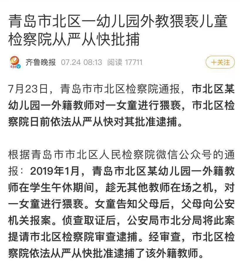 7月23日,据《齐鲁晚报》报道,山东青岛市北区检察院通报了一起幼儿园外教涉猥亵儿童案。据悉,涉事幼儿园为青岛市市北区红黄蓝万科城幼儿园。通报显示,市北区检察院已依法从严从快对其批准逮捕。