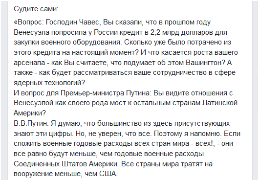 “普京:这位记者问我们,是否认为俄罗斯与委内瑞拉的合作是俄罗斯与该地区其他国家进行交流的桥梁,从某种程度上来说是这样的。如果我们的公司要(在委内瑞拉)建造一个最具现代化的工厂,它不仅会在委内瑞拉创造更多的就业机会,我们认为,这还会将我们的产品推向委内瑞拉邻国的市场,特别是像查韦斯总统刚刚说的那些正与委内瑞拉处于一体化进程当中的国家。”