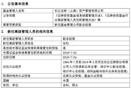 新浪财经讯 7月26日,长江证券(上海)资产管理有限公司关于高级管理人员变更的公告,新任谷松为副总经理,任职日期为2019年7月24日。