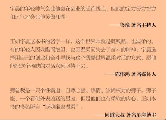 2017年3月,孙宇晨出版了两度登上作家榜的畅销书《这世界既温柔又残酷》,讲述自己通往财富自由之路上的种种经历。这本书的推荐语集结了冯仑、吴晓波、马东、鲁豫、陈伟鸿等知名人士对孙宇晨的花式赞誉。