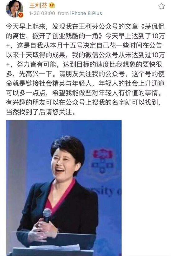 在湖畔大学,孙宇晨还与商战真人秀节目《赢在中国》制片人、优米网创始人王利芬成为朋友和合作伙伴。身份之外,王利芬最出名的事件,是去年1月她就创业者茅侃侃的离世写了篇“10万加”爆款文章,并在微博上庆功。