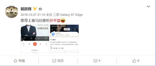 孙宇晨与另一位湖畔同学、电商护肤品牌御泥坊的创始人戴跃锋也小有交情,戴跃锋同样曾在微博上推荐孙宇晨的“财富自由”音频课。