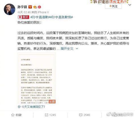 一系列操作后,7月25日凌晨,孙宇晨发布致歉声明,承认自己“过度营销,热衷炒作”,为难看吃相“深感愧疚”,同时向怼过的胡舒立、王小川等前辈,尤其是监管部门解释道歉,也侧面证实有关部门已对他发起关注。