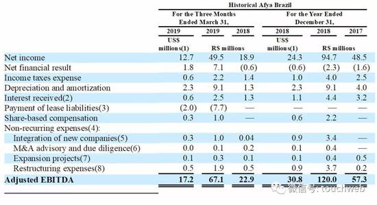 Afya在2019年第一季度营收为1270万美元,经调整EBITDA为1720万美元;Afya在2018年的营收为2430万美元,经调整EBITDA为3080万美元。