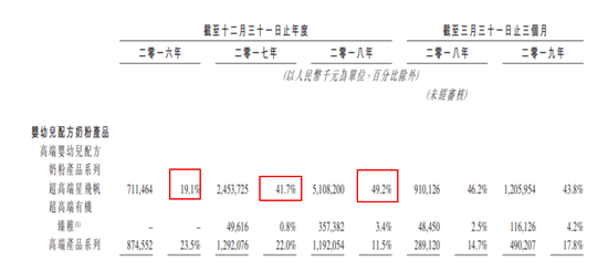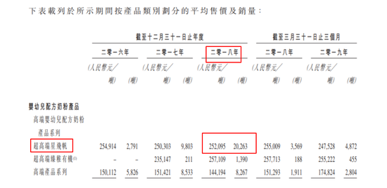 252.1元/千克(2018年)的销售价格只是超高端星飞帆产品的平均出厂价。因公司采取的销售模式主要是经销模式(2016-2018年经销商渠道的销售收入占当期总收入的77.6%、76.7%和67.5%)),故终端产品单价更高。招股书中,飞鹤披露了产品的建议零售价,超高端星飞帆婴幼儿配方奶粉三阶段奶粉建议零售价分别为527.5元/千克、440元/千克和440元/千克。
