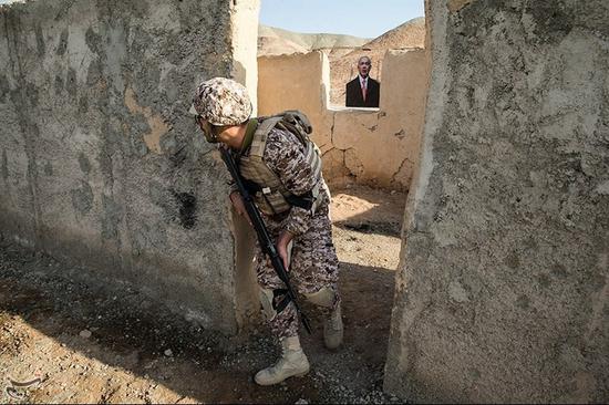 参赛人员正在进行模拟巷战射击比赛,背后是“内塔尼亚胡”。