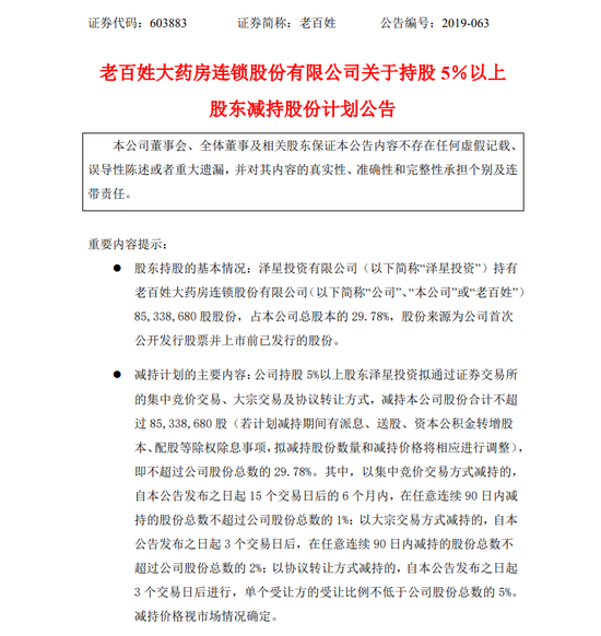 新浪财经讯 7月23日消息,老百姓公告,股东泽星投资拟清仓减持29.78%公司股份,股份来源为公司首次公开发行股票并上市前已发行的股份。