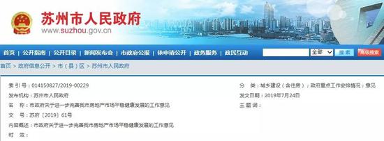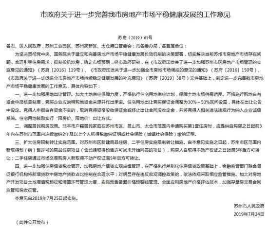 昨天晚间,江苏省苏州市政府出台了进一步完善房地产市场平稳健康发展的工作意见,明确自今天起,从用地出让、居民购房、住房转让、信贷税收四方面合理引导住房需求,抑制投机炒房,稳定市场预期。