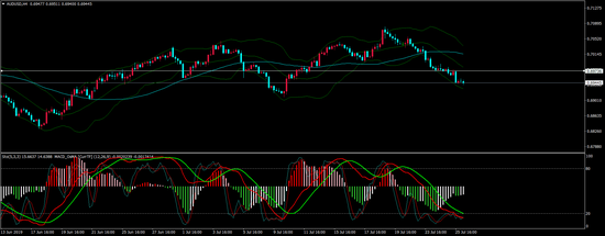 5M:昨日下破0.6980一线转空,至收盘跌势缓和,目前震荡指标趋于超买区,日内上方关注4H前阻力,短线逢高做空。