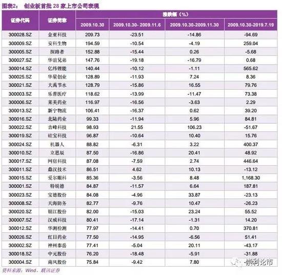 从长期表现来看,创业板的分化更为明显。截至2019年7月19日收盘,爱尔眼科自上市日上涨了11.68倍,而金亚科技则下跌了94.69%,整体看来,创业板首批28家上市公司中多数上涨,上涨公司占比约为68%。