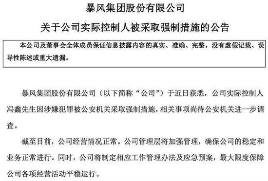 7月28日,据暴风集团公告,公司实际控制人冯鑫因涉嫌犯罪被公安机关采取强制措施,相关事项尚待公安机关进一步调查。