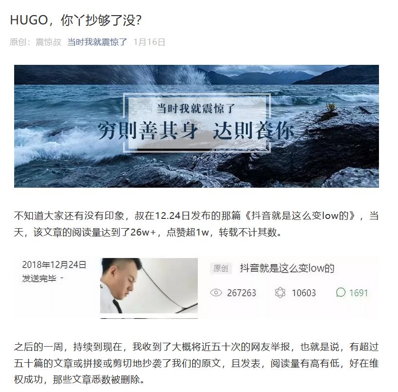此外,HUGO还不时被同行发文斥责抄袭洗稿。比如,1月16日,自媒体“当时我就震惊了”发表文章《HUGO,你丫抄够了没?》,怒斥HUGO 1月15日发的文章《抖音就是这么变low的》抄袭其2018年12月24日发布的同名文章,并表示“HUGO”在多次找他转载文章遭拒后直接搬运大段文字。”
