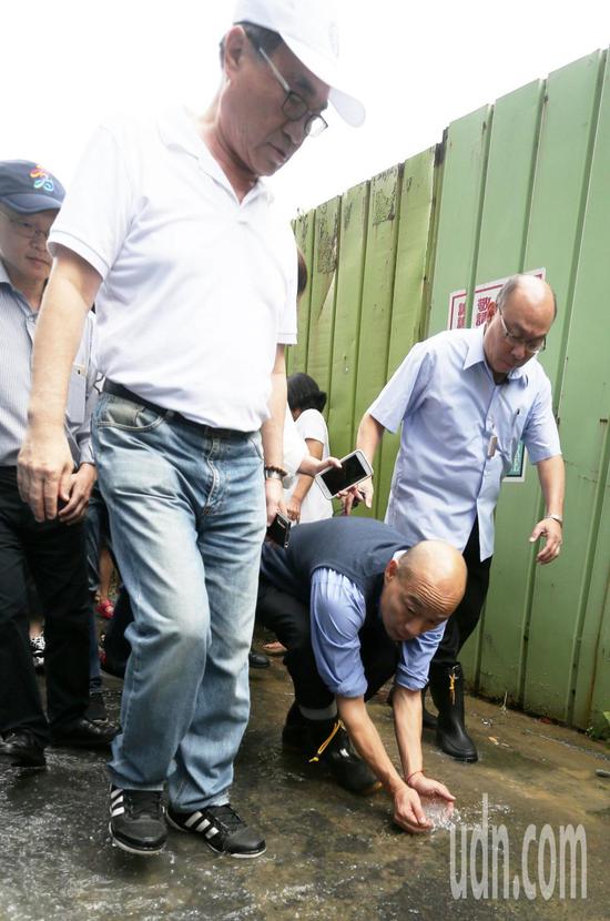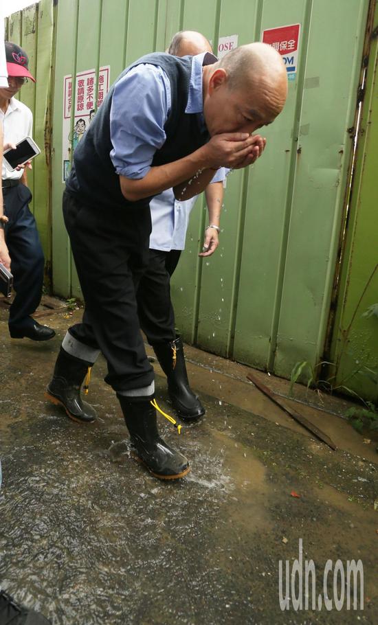 原标题:韩国瑜勘被淹大楼地下室 先掬一把水闻味辨安危