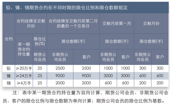 持仓限额是指交易所规定的会员或者客户对某一合约单边持仓的最大数量。有色金属系列的期货合约采用限制会员持仓和限制客户持仓、比例限仓和数额限仓相结合的办法,控制市场风险。某一月份合约在其交易过程中的不同阶段,分别适用不同的持仓限额,进入交割月份的合约的持仓限额从严控制。