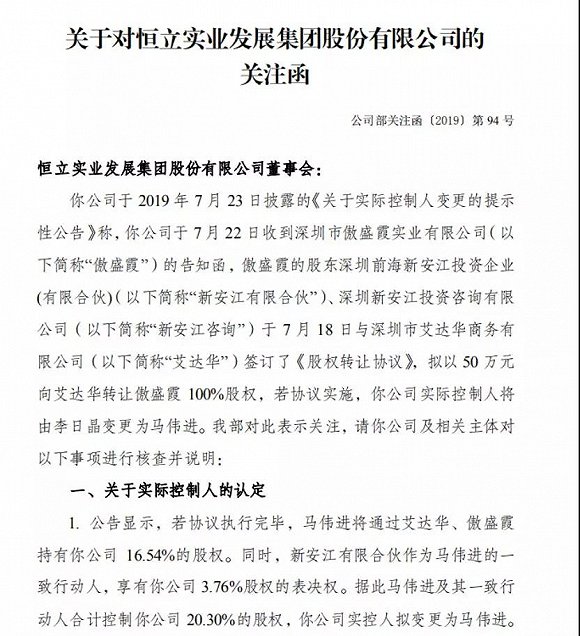 7月23日,深交所公司部对恒立实业实控人变更的事项迅速下发了关注函。深交所要求,公司结合相关主体之间的持股关系,详细说明认定新安江有限合伙与马伟进构成一致行动关系的原因与依据,该一致行动关系的成立与生效时间,相关主体是否履行信息披露义务,并向深交所报备一致行动协议。