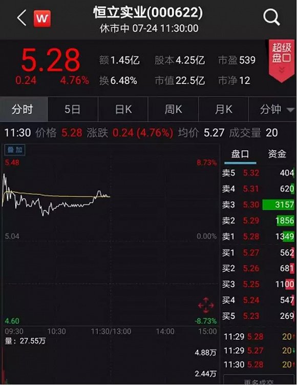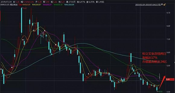 7月23日,恒立实业开盘涨停,收盘报价5.04元。7月24日,恒立实业继续维持涨势,盘中涨势一度触及7%,午盘收盘,恒立实业股价为5.28元,涨幅为4.76%。