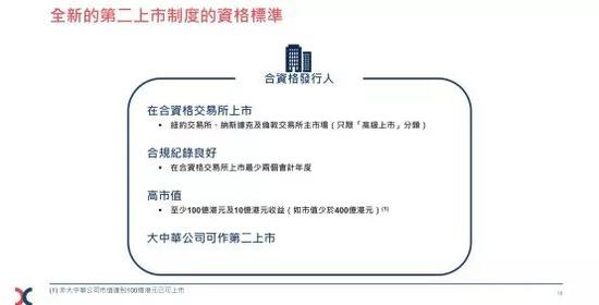 该条例指出,若相关创新产业企业在包括纽交所、纳斯达克以及伦敦交易所主市场上市、并在最近至少两个会计年度有良好的合规记录,且市值不低于100亿港元及10亿港元收益(如果市值低于400亿港元)的话,该企业即有资格赴港二次上市。
