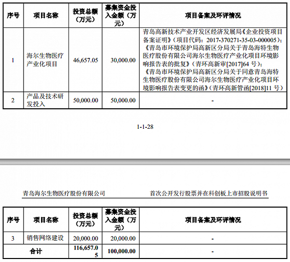 海尔生物计划募集资金10亿元,投入三个项目。其中,海尔生物医疗产业化项目3亿元,产品及技术研发投入5亿元,销售网络建设2亿元。