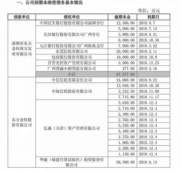 2019年,东方金钰的未清偿债务滚雪球般增加。2019年1月15日,东方金钰公告,称截至2019年1月11日,其新增到期未清偿债务共计约16.7亿元。