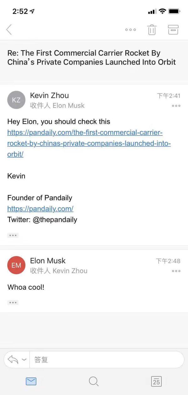 14时41分,一家介绍中国科技行业的英文媒体pandaily创始人周恒星向马斯克发送双曲线一号遥一发射入轨的文章链接。7分钟后,马斯克在邮件中回复“Whoa cool!”。