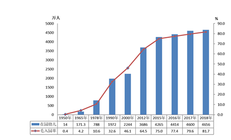 自“二孩”政策开放以来,学前教育近年来颇受关注。统计数据显示,2018年全国共有幼儿园26.67万所,比上年增加1.17万所,增长4.60%。学前教育入园幼儿1863.91万人,比上年减少74.04万人,下降3.82%;在园幼儿4656.42万人,比上年增加56.28万人,增长1.22%。幼儿园教职工453.15万人,比上年增加33.86万人,增长8.08%;专任教师258.14万人,比上年增加14.92万人,增长6.14%。学前教育毛入园率达到81.7%,比上年提高2.1个百分点。