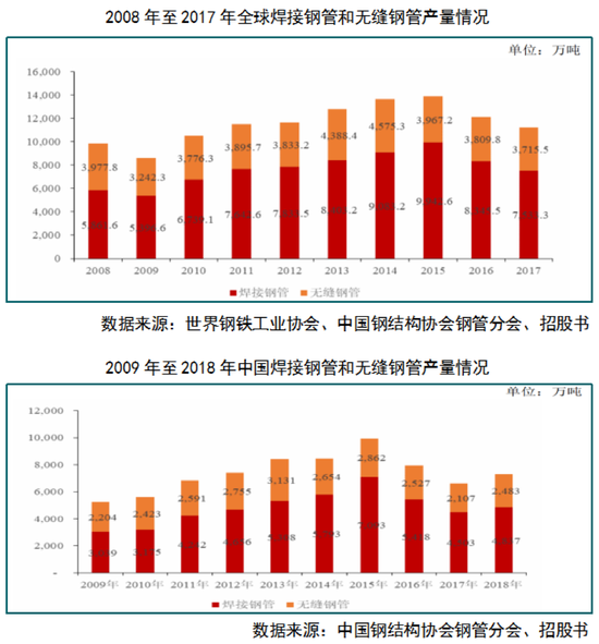 钢管产品被誉为工业的“血管”,是不可或缺的主要钢材品种。近十年,全球钢管行业呈稳步增长态势,全球能源需求增长、基础设施建设均为钢管行业的增长提供了持续动力。据世界钢铁工业协会、中国钢结构协会钢管分会统计,2017年全球生产焊接钢管7533.30万吨,中国焊接钢管总产量为4503万吨;2018年中国焊接钢管总产量为4837万吨。由此简单计算可知,从全球范围看,我国为焊接钢管产量最大的生产国家,生产焊接钢管产量占全球总产量的60%左右。友发集团焊接钢管生产量在全球市场占有率约为17%,在中国的市场占有率约为28%,处于较高水平。