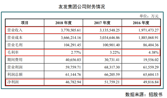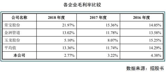 2016年至2018年,友发集团的毛利率分别为4.38%、3.22%、2.77%,相比于对标企业毛利率处于较低水平。招股书显示,友发集团的对标上市公司常宝股份(002478.SZ)2018年毛利率为21.97%、金洲管道(002443.SZ)为13.02%、玉龙股份(601028.SH)为5.10%,均高于友发集团的毛利率水平。然而,常宝股份、金洲管道、玉龙股份2018年实现营业收入分别为 53.76 亿元、48.08亿元、15.23亿元,远低于友发集团2018年的营业收入377.05亿元。