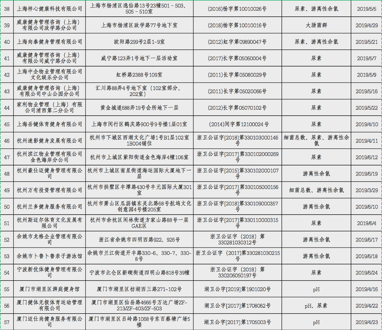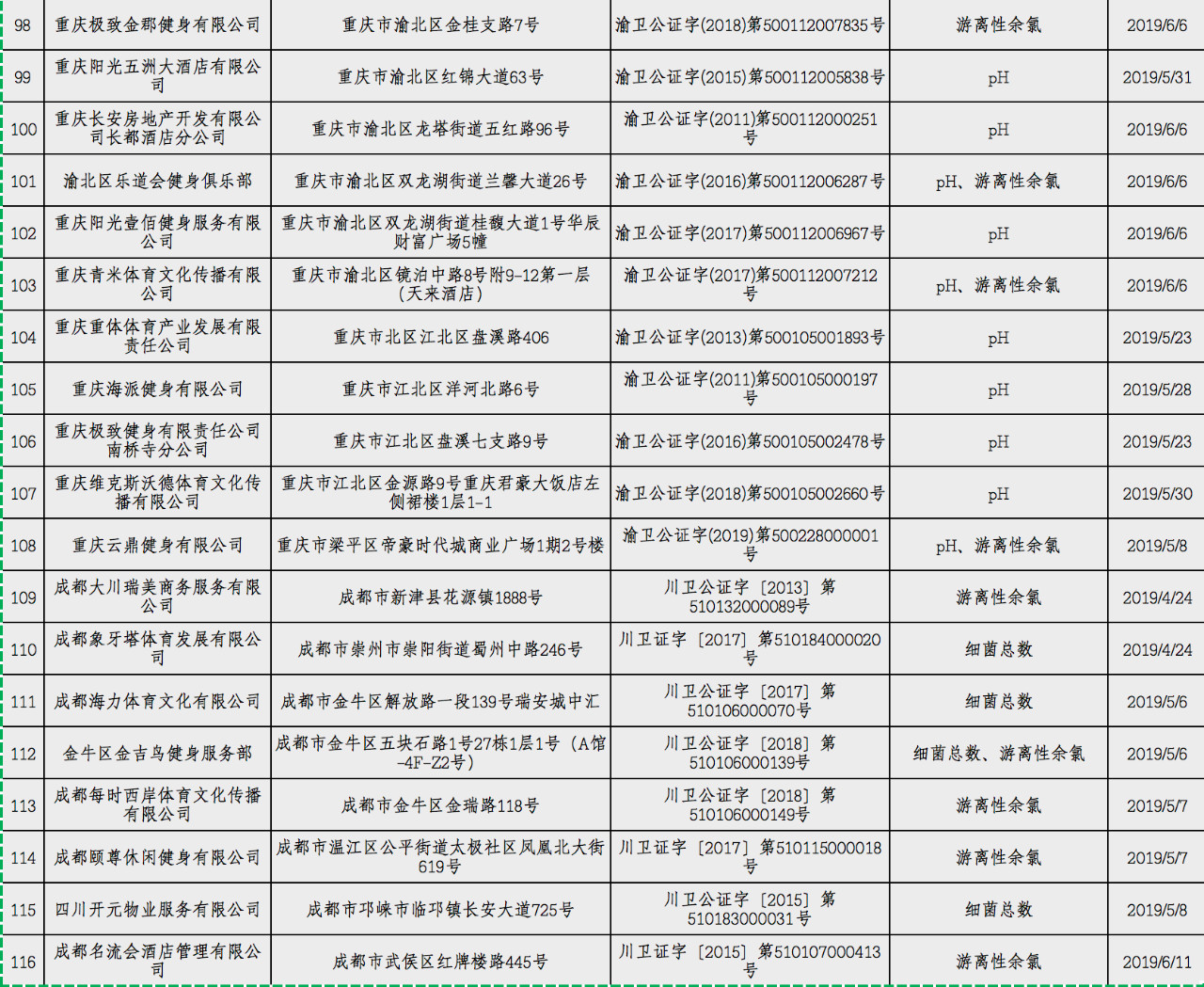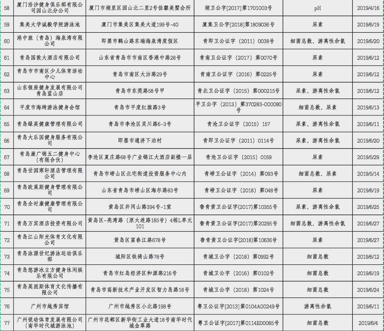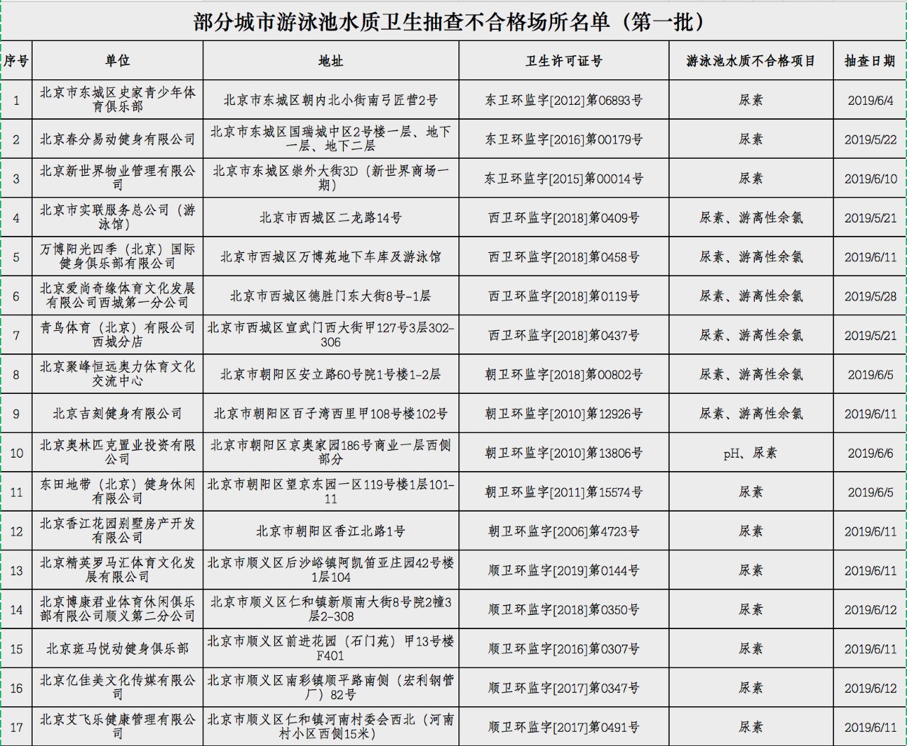 为强化社会监督,督促游泳场所经营者落实卫生安全主体责任, 卫健委决定2019年暑期分两批公布游泳场所较多的北京、上海、杭州、宁波、厦门、青岛、广州、深圳、重庆、成都等城市游泳池水质卫生抽查情况,现公布第一批游泳池水质卫生抽查不合格场所名单。