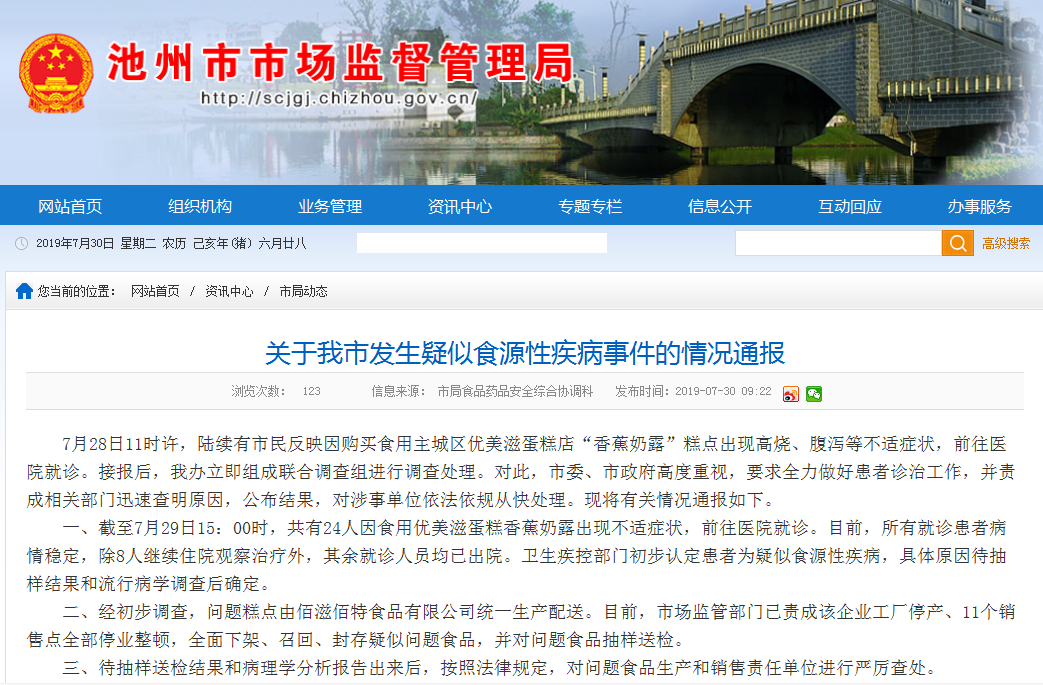新京报快讯 池州市市场监督管理局今日在其官网发布通报,对7月28日出现的陆续有池州市市民反映因购买食用主城区优美滋蛋糕店“香蕉奶露”糕点出现高烧、腹泻等不适症状前往医院就诊一事进行了情况通报。通报全文如下: