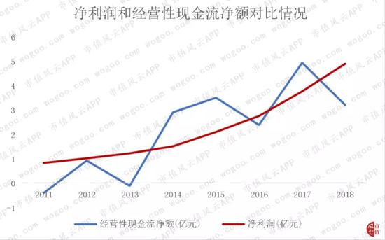 2011-2018年,华宇软件的净利润与经营性现金流净额,整体的趋势是一致的,但经营性现金流净额(蓝线)的波动明显超过净利润(红线)。