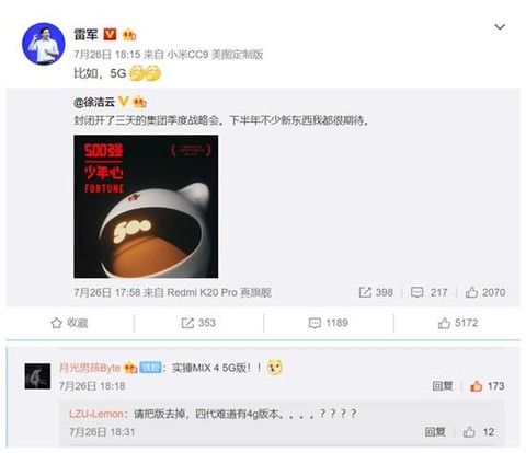 小米创始人、小米集团董事长兼CEO雷军透露,比如5G,暗示下半年将推出5G手机。有网友留言,实锤小米MIX 4会有5G版本。