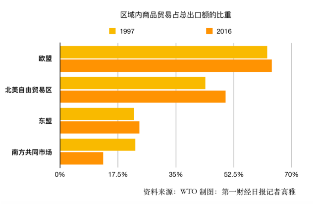 根据世界贸易组织(WTO)《世界贸易数据报告2018》显示,2016年南共市对协议内贸易伙伴的出口额占该组织总出口的13%,还不及1997年的水平。而相比之下,欧盟这一比例高达64%,北美自由贸易区为50%,东盟也有24%,较二十年前均有提升。