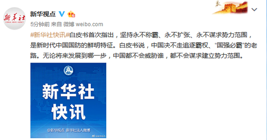 #新华社快讯#白皮书首次指出,坚持永不称霸、永不扩张、永不谋求势力范围,是新时代中国国防的鲜明特征。白皮书说,中国决不走追逐霸权、“国强必霸”的老路。无论将来发展到哪一步,中国都不会威胁谁,都不会谋求建立势力范围。
