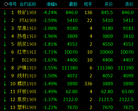 新浪财经讯 7月24日消息,商品期货早盘分化,黑色系领跌,受淡水河谷将重启部分产能消息影响,新加坡铁矿石期货盘中一度跌逾3%,内盘铁矿石跟随大跌逾4%,热卷跌近2%,螺纹、焦炭跌逾1%;能化板块多品种下跌,PTA跌逾2%,纸浆、乙二醇跌逾1%,原油涨逾1%;有色金属延续弱势,沪镍、沪锡跌逾1%;农产品涨跌互现,棕榈涨近2%,白糖、豆油涨逾1%,鲜果期货下行,苹果跌逾2%,红枣跌近2%。