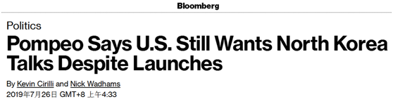彭博社表示,由于周四早上朝鲜“发射导弹”,美朝紧张关系加剧,蓬佩奥发表了上述讲话。报道称,6月30日美朝领导人在板门店会面和会谈后,蓬佩奥曾表示两国将于7月中旬开始会谈。
