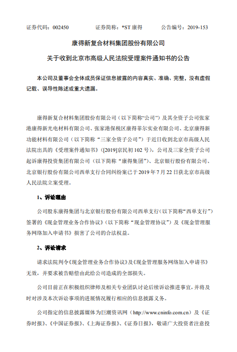 新浪财经讯 7月24日消息,*ST康得发布公告称,公司及三家全资子公司收到北京市高级人民法院出具的《受理案件通知书》,起诉康得集团、北京银行及北京银行西单支行合同纠纷案已于7月22日获立案受理。