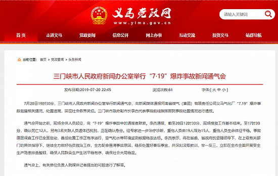 据义马党政网,三门峡市人民政府新闻办公室昨晚举行“7·19”爆炸事故新闻通气会。截至20日12时30分,现场搜救工作基本结束。至17时30分,确认死亡12人,另有3名失联人员遗体已找到,正在确认身份。三门峡市将立即在全市全面开展安全生产隐患排查整顿。