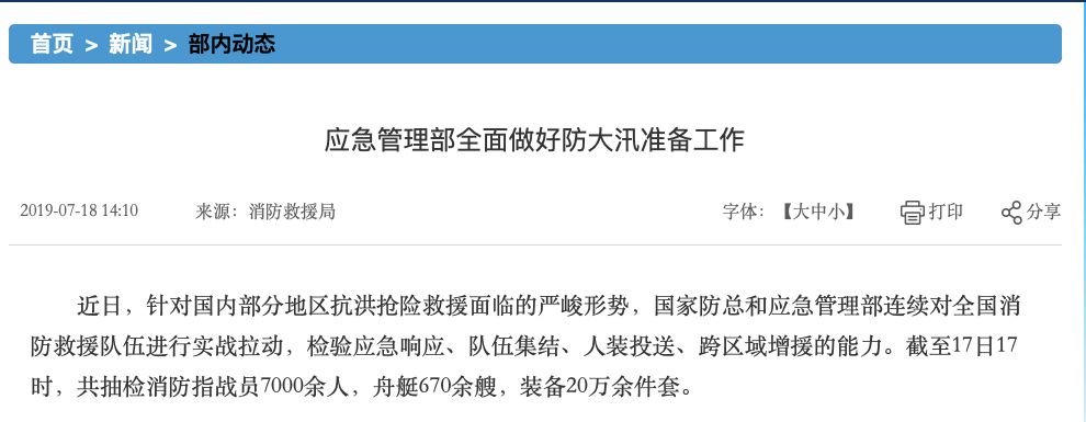 就在李克强赴应急部的前一天,应急部发布了一则消息,名称为《应急管理部全面做好防大汛准备工作》。