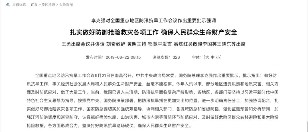 其二,在李克强此次调研的一个月前,高层曾在江西南昌刚刚召开了一场高规格会议——全国重点地区防汛抗旱工作会议。