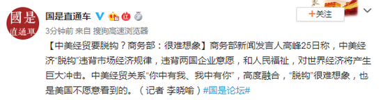 商务部新闻发言人高峰25日称,中美经济“脱钩”违背市场经济规律,违背两国企业意愿,和人民福祉,对世界经济将产生巨大冲击。中美经贸关系“你中有我、我中有你”,高度融合,“脱钩”很难想象,也是美国不愿意看到的。(记者 李晓喻)#国是论坛#
