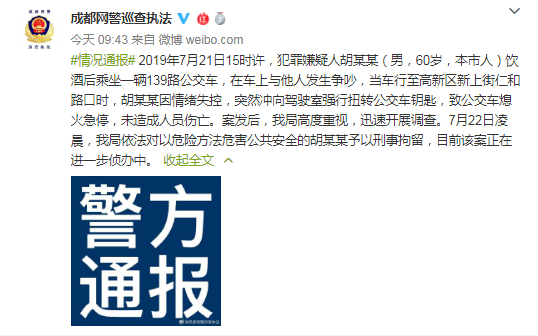 新京报快讯 成都市公安局网络安全保卫支队今日在其官微发布了一则警情通报,通报称,2019年7月21日15时许,犯罪嫌疑人胡某某(男,60岁,成都市人)饮酒后乘坐一辆139路公交车,在车上与他人发生争吵,当车行至成都市高新区新上街仁和路口时,胡某某因情绪失控,突然冲向驾驶室强行扭转公交车钥匙,致公交车熄火急停,未造成人员伤亡。案发后,警方迅速开展调查。7月22日凌晨,依法对以危险方法危害公共安全的嫌疑人胡某某予以刑事拘留,目前该案正在进一步侦办中。